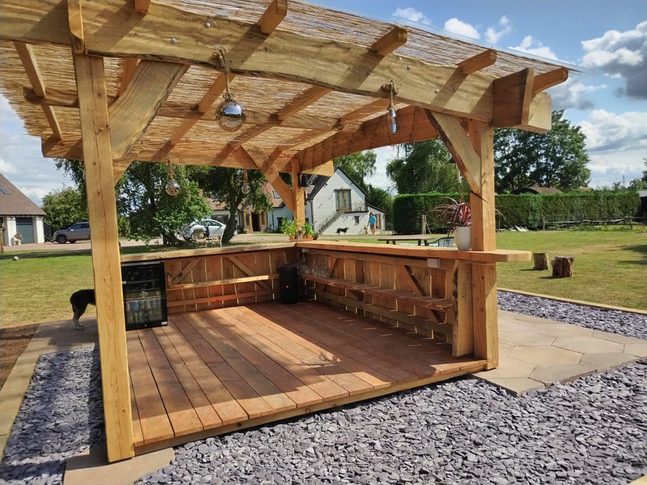 This Grand Curvy Bar is 14ft x 10ft, fully decked with a clear corrugated pvc roof laid with reeds to give lots of light but also shade and shelter. The reeds give a lovely dappled effect in the sunshine.